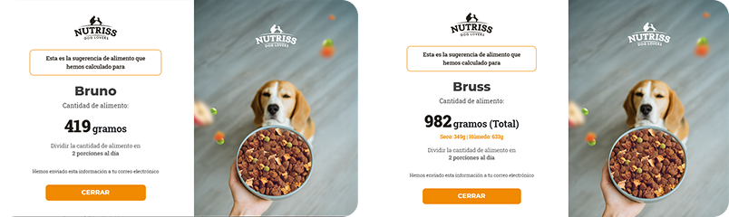 Con todos estos datos, la calculadora te dará una recomendación personalizada para ofrecerle a tu perro una alimentación completa, balanceada y deliciosa, combinando lo mejor del alimento seco y el húmedo.